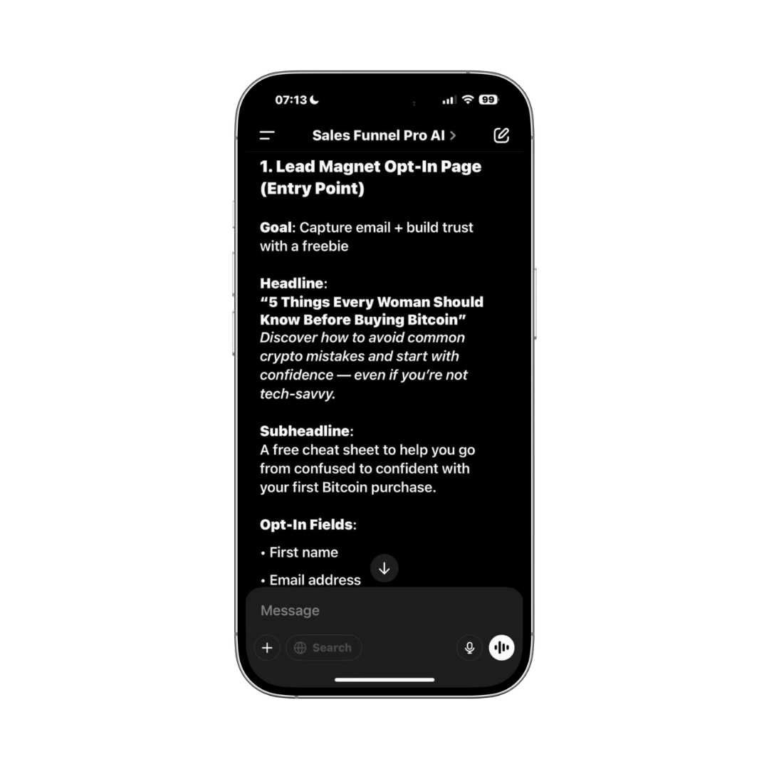 “I used to feel overwhelmed trying to stitch together funnels, emails, and ads from YouTube tutorials. Now I just chat with Sales Funnel Pro AI and it tells me exactly what to do next.”